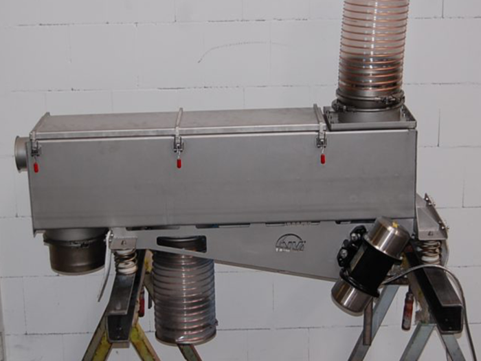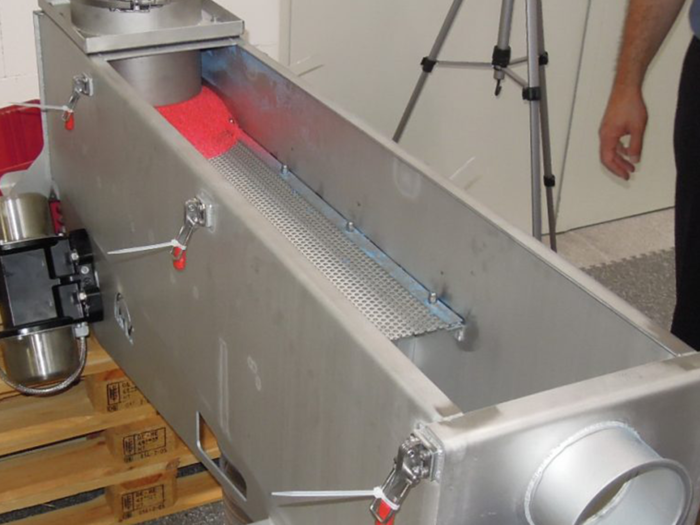 Der Kunde setzte ein Siebfördersystem ein, angetrieben von einem Elektro-Außenvibrator NEG. Damit ergibt sich eine simultane Förderung und Trennung des Material und eine Abführung über separate Ausgänge.