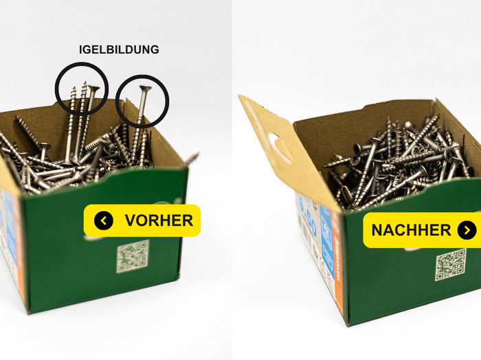 - Schrauben richten sich im Karton auf, verhaken sich miteinander und verursachen Igelbildung